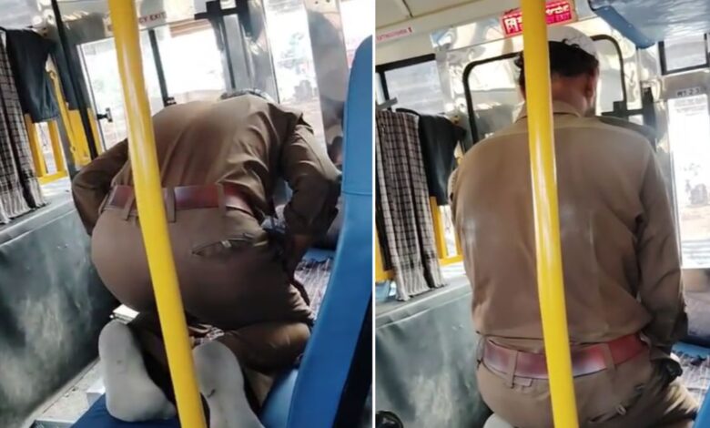 बस के अंदर नमाज पढ़ता कर्मचारी