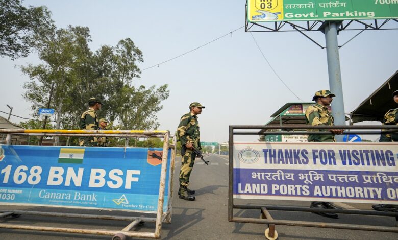अमृतसर में अटारी-वाघा बॉर्डर के पास एकीकृत चेक पोस्ट पर पहरा देते बीएसएफ के जवान।
