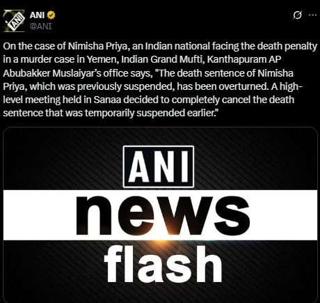 भारतीय नर्स निमिषा प्रिया को यमन में सुनाई गई मौत की सजा को पूरी तरह रद्द कर दिया गया है. इस बात की जानकारी भारत के ग्रैंड मुफ्ती कंथापुरम एपी अबूबकर मुसलियार के कार्यालय ने एक बयान जारी कर दी है. हालांकि बयान में ये भी स्पष्ट किया गया कि अभी यमन की सरकार से आधिकारिक लिखित पुष्टि प्राप्त नहीं हुई है. बयान में कहा गया है कि निमिषा प्रिया की मौत की सजा, जिसे पहले स्थगित किया गया था, अब पूरी तरह से रद्द कर दी गई है.