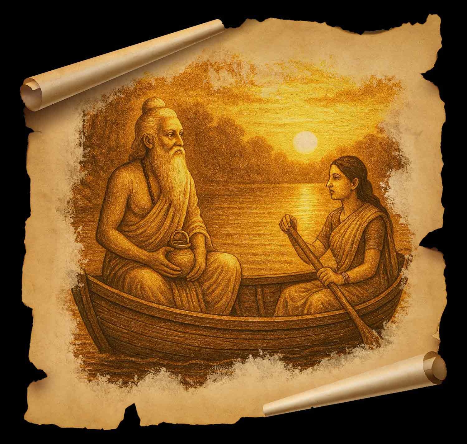 वह रूप और सत्‍व (सत्‍य) से संयुक्त तथा समस्‍त सद्गुणों से सम्‍पन्न होने के कारण ‘सत्‍यवती’ नाम से प्रसिद्व हुई. मछेरों के आश्रय में रहने के कारण वह पवित्र मुस्‍कान वाली कन्‍या मत्‍स्‍य गंधा भी कहलाई. वह देवी पिता की सेवा के लिये यमुना जी के जल में नाव चलाया करती थीं. एक दिन तीर्थयात्रा के उद्देश्‍य से सब ओर विचरने वाले म‍हर्षि पराशर ने उनकी नाव में बैठकर नदी पार की.