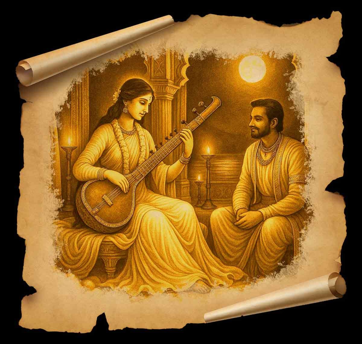 हस्तिनापुर आकर गंगा और शांतनु सुखपूर्वक दिन बिताने लगे. महाराज शांतनु उन्हें बहुत प्रेम करते थे और अपना अधिकांश समय रनिवास (महल रानी के रहने का स्थान या कमरा) में ही बिताते थे. देवी गंगा भी उन्हें बहुत प्रेम करती थीं. एक रात देवी गंगा उन्हें वीणा बजाते हुए राग रागेश्वरी सुना रही थीं. महाराज शांतनु ने उन्हें सुनते हुए आंखों ही आंखों में पूरी रात बिता दी. राग समाप्त हुआ, देवी गंगा वीणा वादन भी बंद कर चुकी थीं, लेकिन शांतनु अपलक उन्हें देखते ही रहे. देवी गंगा ने कहा- महाराज भोर होने को आई है, आप ऐसे क्या देख रहे हैं?