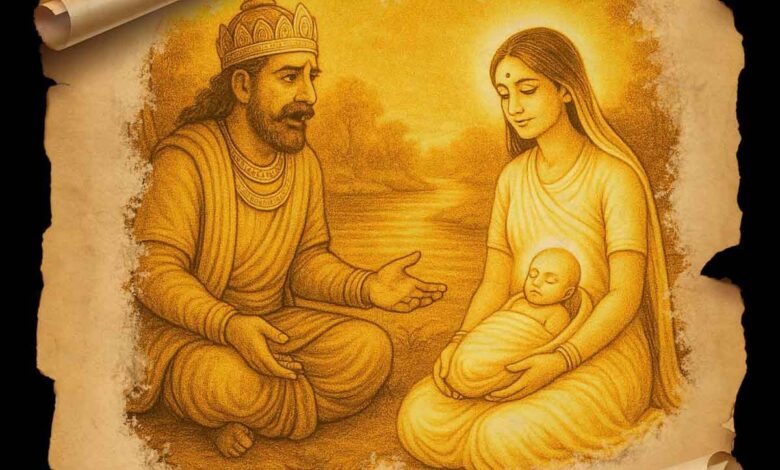ऐसे ही किसी दिन, रानी गंगा के कक्ष से फिर यह समाचार आया कि वह आठवीं बार गर्भवती हैं, लेकिन इस बार महाराज ने कोई प्रसन्नता नहीं दिखाई, बल्कि वह एक और नवजात की असमय मृत्यु की कल्पना से जड़ हो गए और इसी चिंता में खोए हुए रहने लगे. समय पर महारानी ने एक स्वस्थ और शुभ लक्षणों से युक्त बालक को जन्म दिया. उन्होंने उसे दुग्धपान कराया, सीने से लगाया और फिर वही प्रक्रिया… देवी गंगा अपने आठवें पुत्र को लेकर भी राजमहल से बाहर आ गईं.